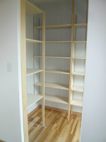 納戸の中には、可動棚が付いています。棚の形や数は、お客さんとの打合せで決定します。